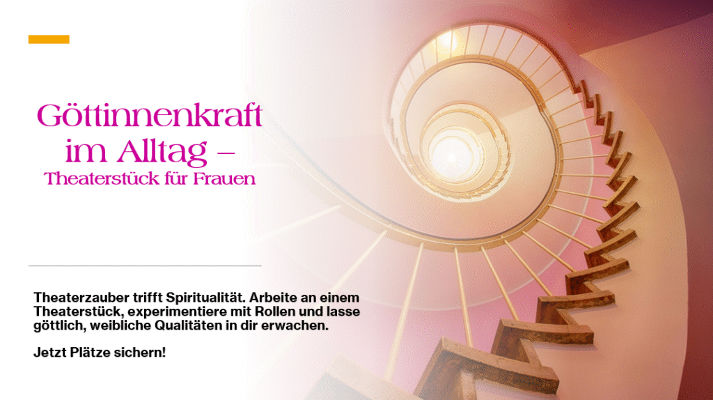In diesem Kurs tauchst du ein in eine Welt zwischen Bühne und Spiritualität. Wir proben das Stück „Göttinnenkraft im Alltag“, welches wir am letzten Termin präsentieren. Erlebe die Magie kindlicher Leichtigkeit, die uns hilft spielerisch unsere Masken fallen zu lassen – und staune, wie göttliche, weibliche Qualitäten wieder lebendig in dir erwachen. Du kannst dich schauspielerisch ausprobieren, lachen, staunen und dabei tiefer fühlen. Durch das Spielen deiner Rolle wird dir vielleicht bewusst, welche göttlich, weiblichen Qualitäten, du mehr leben möchtest. Bist du bereit mit mir auf diese Reise zu gehen?